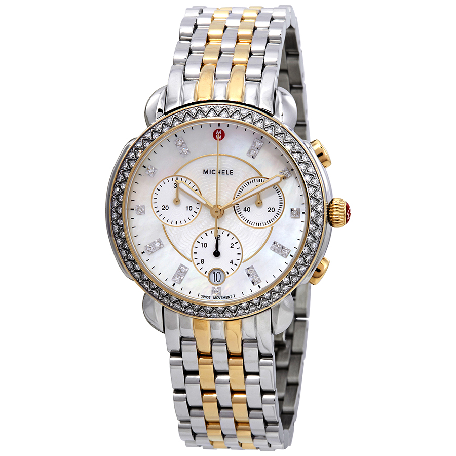 Silver and gold-tone stainless steel case with a silver and gold-tone stainless steel bracelet. Fixed stainless steel- diamond set bezel. Mother of pearl dial with gold-tone hands and silver-tone hour markers. Dial Type: Analog. Date display at the 6 o'clock position. Chronograph - three sub-dials displaying: 60 second, 30 minute and 12 hours. Quartz movement. Scratch resistant sapphire crystal. Round case shape. Case size: 38 mm. Band width: 18 mm. Water resistant at 50 meters / 165 feet. Functions: chronograph, date, hour, minute, second. Dress watch style. Watch label: Swiss Made. Michele Sidney Mother of Pearl Dial Ladies Chronograph Two Tone Watch MWW30A000005.