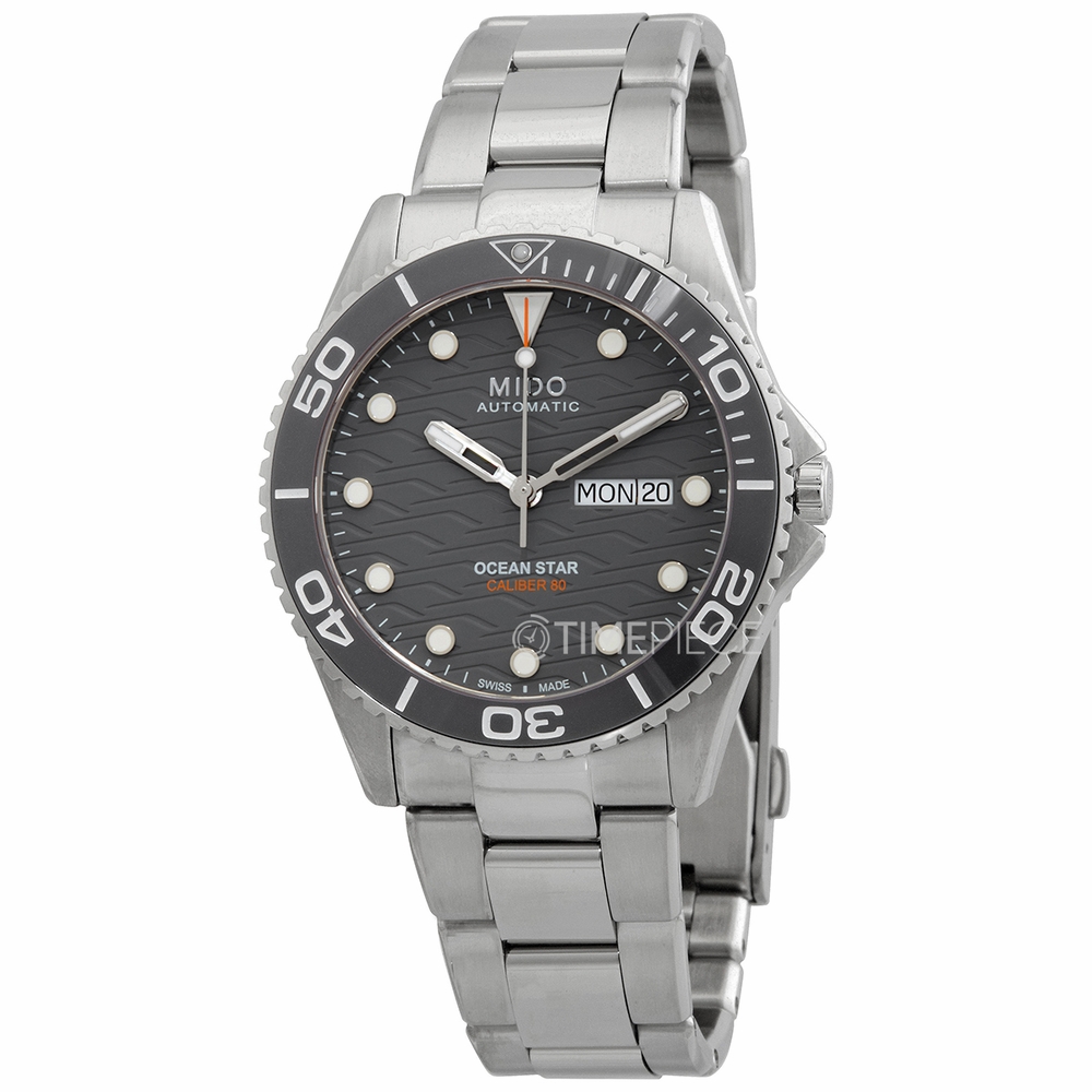 Silver-tone stainless steel case and bracelet. Uni-directional rotating grey ceramic bezel. Grey dial with silver-tone hands and index hour markers. Minute markers around the outer rim. Dial Type: Analog. Luminescent hands and markers. Day of the week and date display at the 3 o'clock position. Mido Calibre Powermatic 80 (ETA C07.621) Automatic movement, based upon ETA 2824-2, containing 23 Jewels, bitting at 21600 vph, and has a power reserve of approximately 80 hours. Scratch resistant sapphire crystal. Screw down crown. Solid case back. Round case shape, case size: 42.5 mm, case thickness: 12.3 mm. Band width: 22 mm. Folding clasp. Water resistant at 200 meters / 660 feet. Functions: date, day, hour, minute, second. Ocean Star Series. Dive watch style. Watch label: Swiss Made. Mido Ocean Star Automatic Grey Dial Mens Watch M0424301108100.