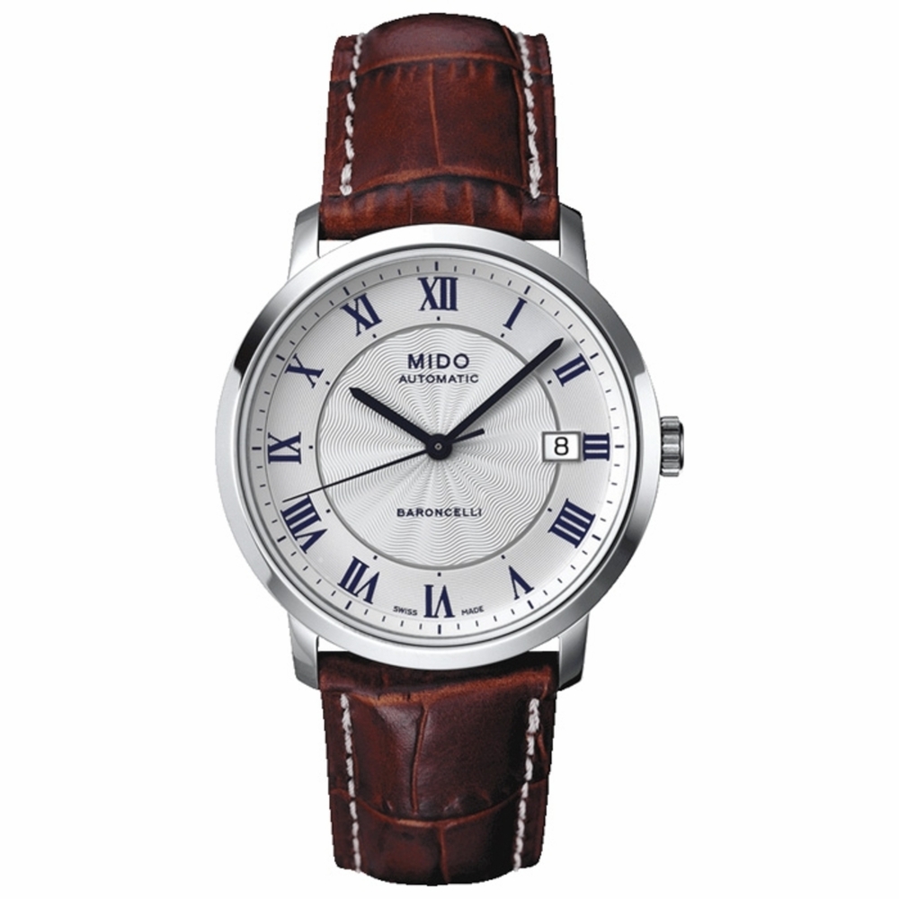 Stainless steel case with a brown leather strap. Fixed stainless steel bezel. Silver dial with black hands and Roman numeral hour markers. Minute markers around the outer rim. Dial Type: Analog. Date display at the 3 o'clock position. Automatic movement. Scratch resistant sapphire crystal. Pull / push crown. Solid case back. Round case shape. Case size: 37 mm. Tang clasp. Water resistant at 30 meters / 100 feet. Functions: date, hour, minute, second. Baroncelli Series. Casual watch style. Watch label: Swiss Made. Mido Baroncelli Automatic Silver Dial Mens Watch M3895.4.21.8.