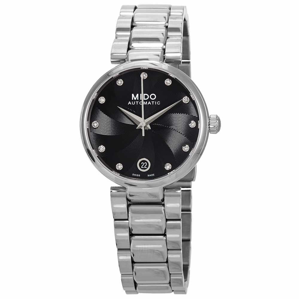 Silver-tone stainless steel case and bracelet. Fixed bezel. Black dial with rose gold-tone hands and diamond hour markers. Dial Type: Analog. Date display at the 6 o'clock position. Mido Calibre 80 automatic movement with an 80-hour power reserve. Scratch resistant sapphire crystal. Pull / push crown. Transparent see through case back. Round case shape, case size: 33 mm, case thickness: 10.60 mm. Water resistant at 50 meters / 165 feet. Functions: date, hour, minute, second. Additional Info: dial set with 11 diamonds (0.055 ct). Baroncelli Donna Series. Dress watch style. Watch label: Swiss Made. Mido Baroncelli Donna Automatic Diamond Black Dial Ladies Watch M022.207.11.056.10.