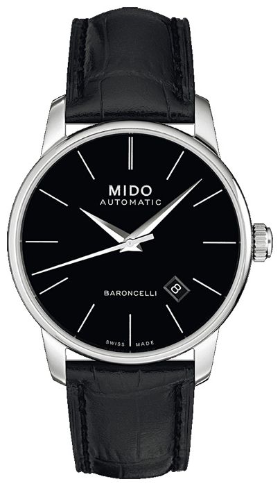 Stainless steel case with a black leather strap. Fixed stainless steel bezel. Black dial with silver-tone hands and index hour markers. Dial Type: Analog. Date display between the 4 and 5 o'clock positions. ETA caliber 2824-2 automatic movement, based upon ETA 2824, containing 25 Jewels, bitting at 28800 vph, and has a power reserve of approximately 38 hours. Scratch resistant sapphire crystal. Pull / push crown. Transparent case back. Round case shape. Case size: 38 mm. Case thickness: 9.8 mm. Band width: 19 mm. Tang clasp. Water resistant at 50 meters / 165 feet. Functions: date, hour, minute, second. Baroncelli II Series. Casual watch style. Watch label: Swiss Made. Mido Baroncelli II Automatic Black Dial Mens Watch M8600.4.78.4.