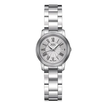 Stainless steel case with a stainless steel bracelet. Fixed stainless steel bezel. Silver dial with silver-tone hands and Roman numeral hour markers. Minute markers around the outer rim. Dial Type: Analog. Date display at the 3 o'clock position. Automatic movement. Scratch resistant sapphire crystal. Pull / push crown. Transparent case back. Round case shape. Case size: 25 mm. Band width: 13 mm. Fold over clasp. Water resistant at 50 meters / 165 feet. Functions: date, hour, minute, second. Baroncelli IIi Series. Dress watch style. Watch label: Swiss Made. Mido Baroncelli III Automatic Silver Dial Ladies Watch M0100071103309.