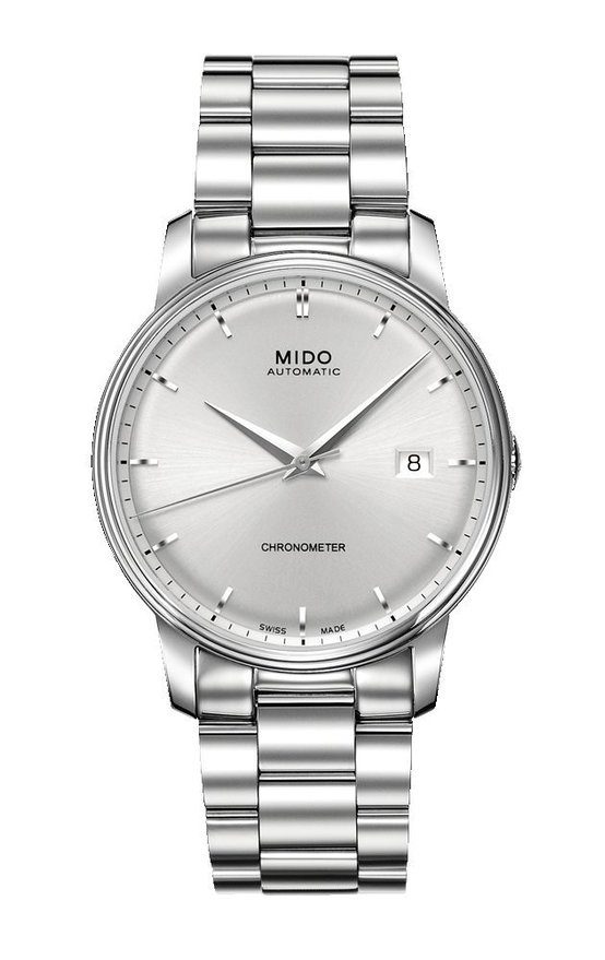 Silver-tone stainless steel case and bracelet. Fixed silver-tone stainless steel bezel. Silver dial with silver-tone hands and index hour markers. Minute markers around the outer rim. Dial Type: Analog. Date display at the 3 o'clock position. ETA Caliber 2836-2 (COSC) Automatic movement, based upon ETA 2824-2, containing 25 Jewels, bitting at 28800 vph, and has a power reserve of approximately 40 hours. Scratch resistant sapphire crystal. Pull / push crown. Transparent case back. Round case shape, case size: 39 mm, case thickness: 11 mm. Band width: 20 mm. Fold over clasp. Water resistant at 50 meters / 165 feet. Functions: date, hour, minute, second. Baroncelli IIi Series. Casual watch style. Watch label: Swiss Made. Mido Baroncelli III Automatic Silver Dial Mens Watch M0104081103100.
