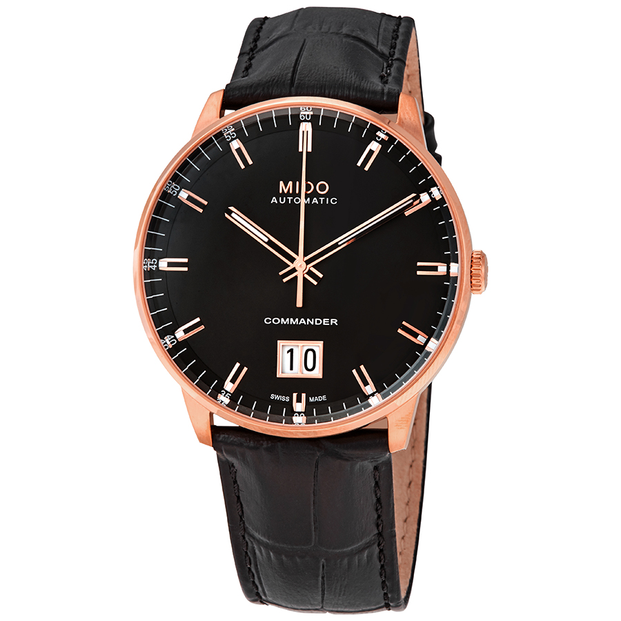 Rose gold PVD stainless steel case with a black leather strap. Fixed rose gold PVD bezel. Black dial with luminous rose gold-tone hands and index hour markers. Minute markers around the outer rim. Dial Type: Analog. Luminescent hands and markers. Date display above the 6 o'clock position. Mido calibre 80 (base ETA C07.651) automatic movement, based upon ETA C07.651, containing 25 Jewels, bitting at 21600 vph, and has a power reserve of approximately 80 hours. Scratch resistant sapphire crystal. Pull / push crown. Transparent case back. Round case shape. Case size: 42 mm. Case thickness: 11.97 mm. Band width: 22 mm. Butterfly clasp. Water resistant at 50 meters / 165 feet. Functions: date, hour, minute, second. Comander Series. Dress watch style. Watch label: Swiss Made. Mido Comander Automatic Black Dial Mens Watch M021.626.36.051.00.