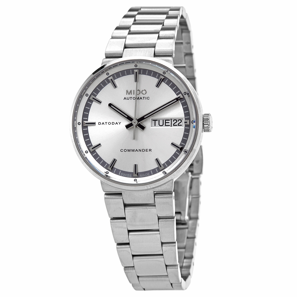Silver-tone stainless steel case and bracelet. Fixed bezel. Silver dial with silver-tone hands and index hour markers. Dial Type: Analog. Day of the week and date display at the 3 o'clock position. Automatic movement. Scratch resistant sapphire crystal. Solid case back. Round case shape, case size: 33 mm. Water resistant at 50 meters / 165 feet. Functions: date, day, hour, minute, second. Commander II Series. Dress watch style. Watch label: Swiss Made. Mido Commander II Automatic Silver Dial Ladies Watch M014.230.11.031.80.