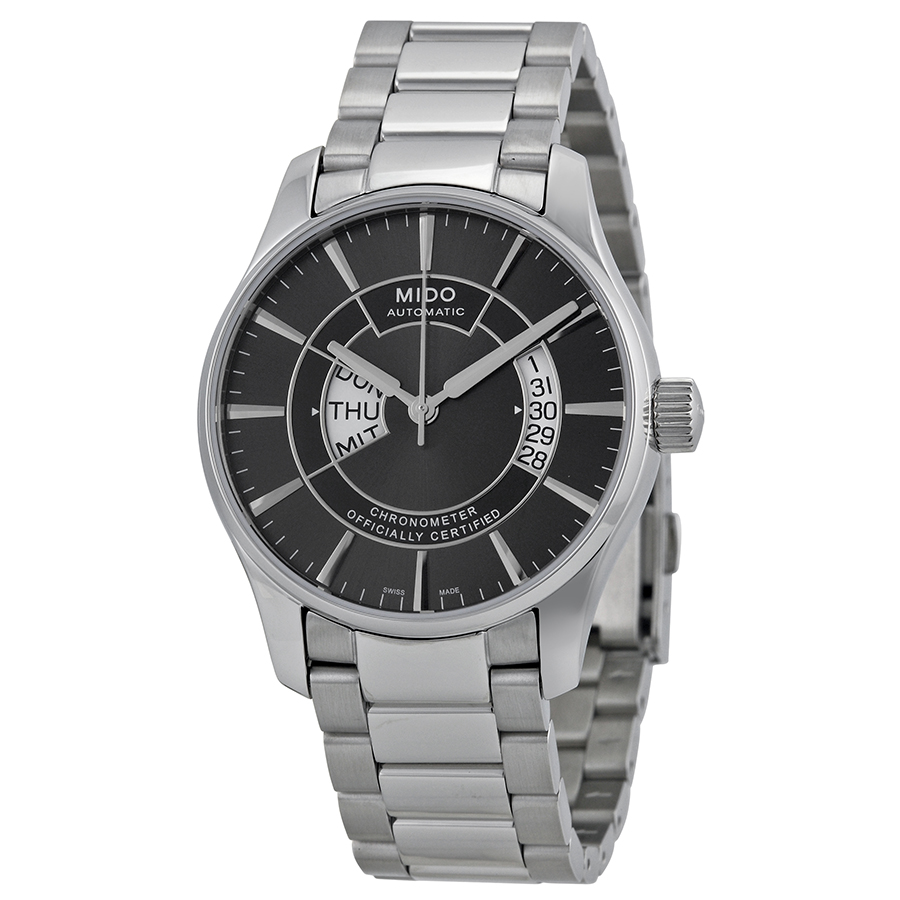 Stainless steel case with a stainless steel bracelet. Fixed stainless steel bezel. Black dial with silver-tone hands and index hour markers. Minute markers around the outer rim. Dial Type: Analog. Date display at the 3 o'clock position. Day of the week display at the 9 o'clock position. Swiss automatic movement. Scratch resistant sapphire crystal. Screw down crown. Skeleton case back. Case diameter: 40 mm. Case thickness: 10.3 mm. Round case shape. Band width: 19 mm. Band length: 9 inches. Deployment clasp. Water resistant at 100 meters / 330 feet. Functions: date, day, hour, minute, second. Casual watch style. Mido Belluna Automatic Chronometer Black Dial Stainless Steel Mens Watch M0014311106102.