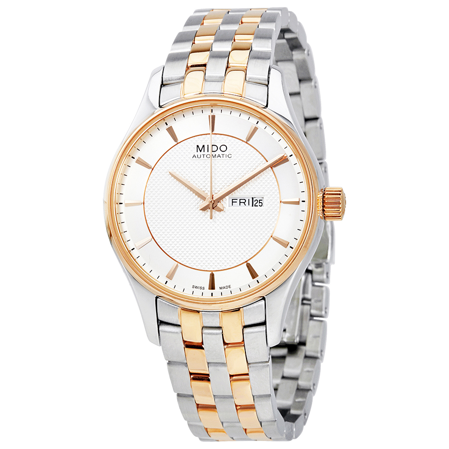 Stainless steel case with a two-tone (silver-tone and rose gold PVD) stainless steel bracelet. Fixed rose gold PVD bezel. Silver dial with rose gold-tone dauphine-style hands and index hour markers. Minute markers around the outer rim. Dial Type: Analog. Day of the week and date display at the 3 o'clock position. ETA caliber 2678 automatic movement, based upon ETA 2671, containing 25 Jewels, bitting at 28800 vph, and has a power reserve of approximately 38 hours. Scratch resistant sapphire crystal. Pull / push crown. Transparent case back. Round case shape, case size: 33 mm. Case thickness: 10.45 mm. Band width: 16 mm. Fold over clasp with a double push button release. Water resistant at 100 meters / 330 feet. Functions: date, day, hour, minute, second. Belluna Series. Casual watch style. Watch label: Swiss Made. Mido Belluna Automatic Silver Dial Ladies Watch M0012302203191.