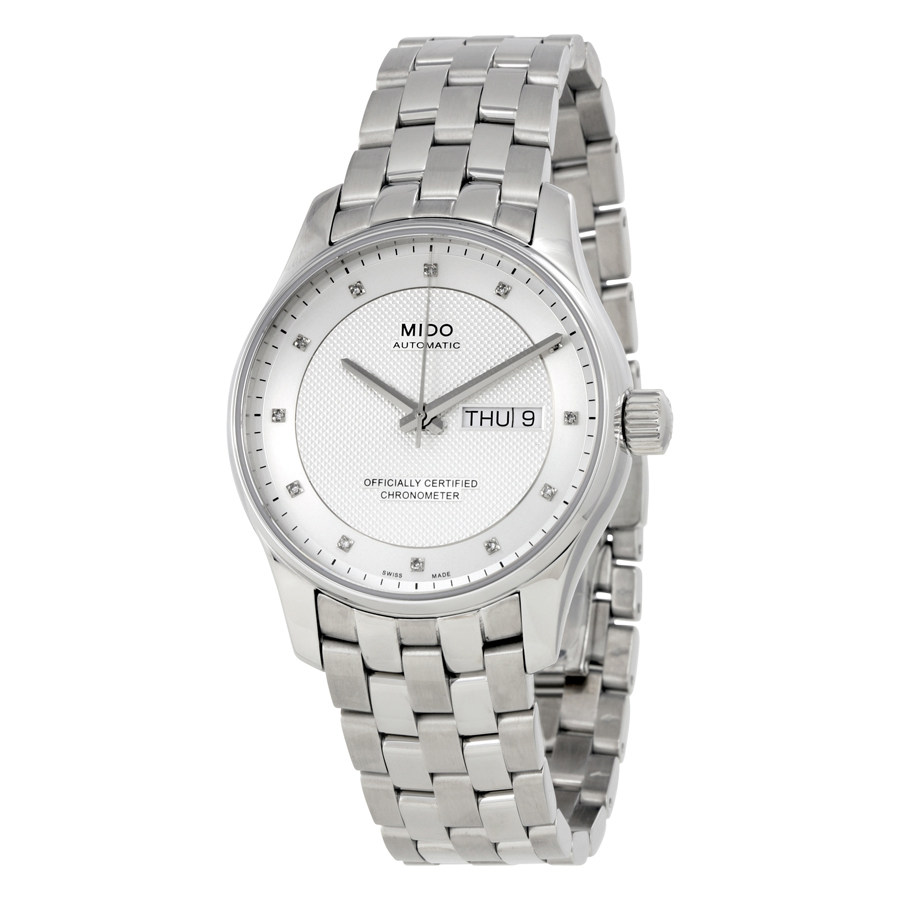 Stainless steel case with a stainless steel bracelet. Fixed stainless steel bezel. Silver dial with silver-tone hands and diamond hour markers. Minute markers around the outer rim. Dial Type: Analog. Day of the week and date display at the 3 o'clock position. ETA caliber 2678 automatic movement, based upon ETA 2671, containing 25 Jewels, bitting at 28800 vph, and has a power reserve of approximately 38 hours. Scratch resistant sapphire crystal. Pull / push crown. Transparent case back. Round case shape. Case size: 40 mm. Case thickness: 10.45 mm. Band width: 22 mm. Fold over clasp with a double push button release. Water resistant at 100 meters / 330 feet. Functions: date, day, hour, minute, second. Belluna Series. Casual watch style. Watch label: Swiss Made. Mido Belluna Automatic Silver Dail Mens Watch M0014311103692.