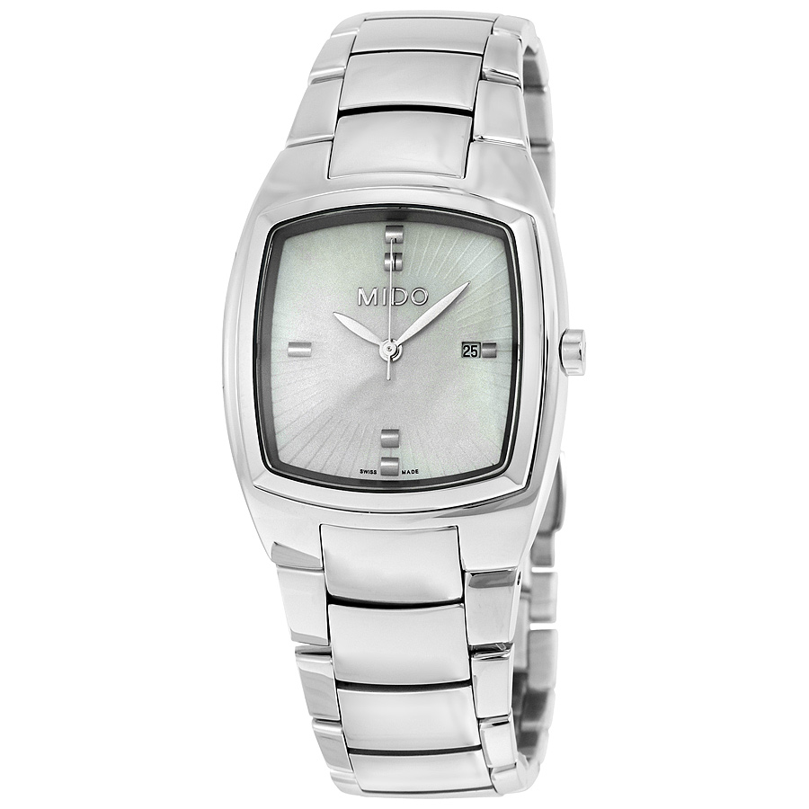 Stainless steel case with a stainless steel bracelet. Fixed stainless steel bezel. Mother of pearl dial with silver-tone hands. Index markers at the 3, 6, 9 and 12 o'clock positions. Dial Type: Analog. Date display at the 3 o'clock position. Quartz movement. Scratch resistant sapphire crystal. Pull / push crown. Solid case back. Case dimensions: 30 mm x 31 mm. Case thickness: 7.8 mm. Tonneau case shape. Water resistant at 50 meters / 165 feet. Functions: date, hour, minute, second. Luxury watch style. Watch label: Swiss Made. Mido Romantique Ladies Watch M004.310.11.101.00.