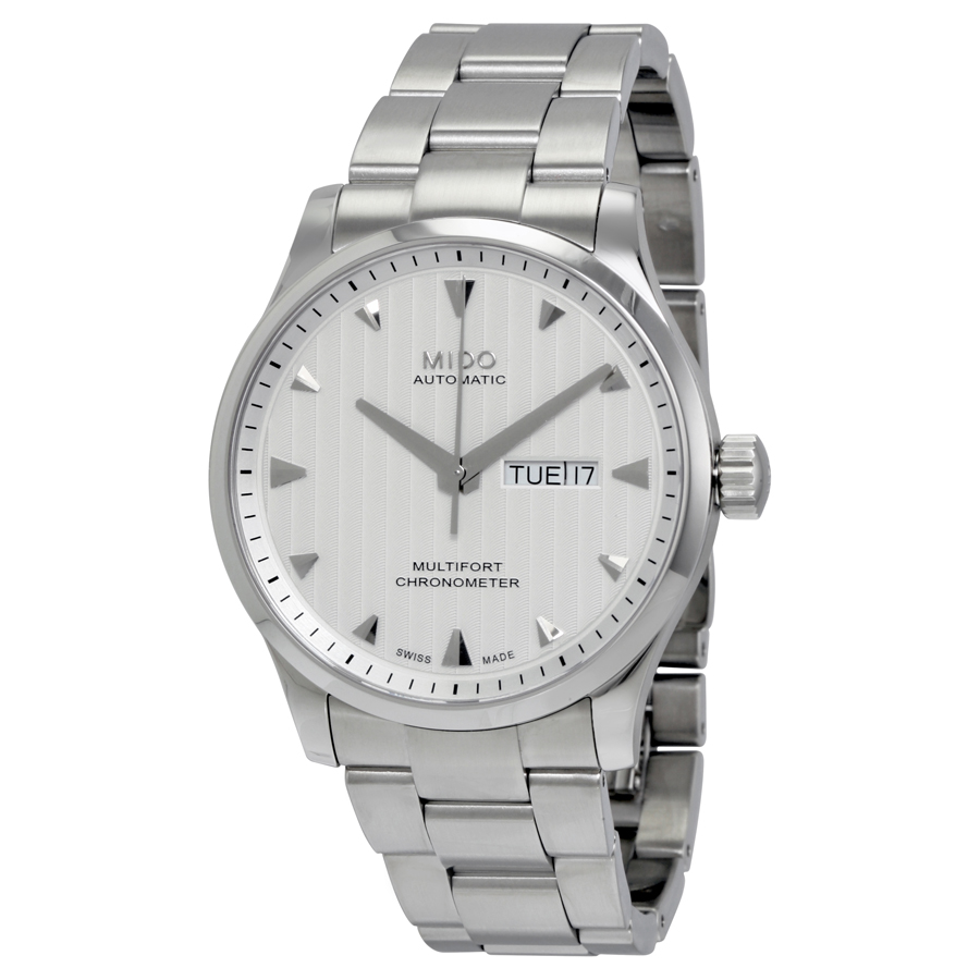Stainless steel case with a stainless steel bracelet. Fixed stainless steel bezel. Silver dial with silver-tone hands and index hour markers. Minute markers around the outer rim. Dial Type: Analog. Day of the week and date display at the 3 o'clock position. Calibre 80.621 COSC automatic movement with an 80-hour power reserve. Scratch resistant sapphire crystal. Transparent case back. Case size: 42 mm. Case thickness: 10.95 mm. Round case shape. Band width: 22 mm. Deployment clasp. Water resistant at 100 meters / 330 feet. Functions: date, day, hour, minute, second. Casual watch style. Watch label: Swiss Made. Mido Multifort Automatic Silver Dial Watch M005.431.11.031.00.