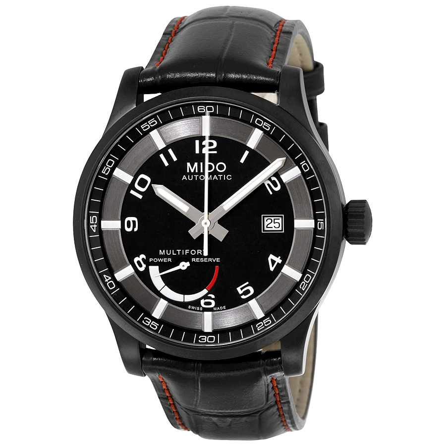 Black PVD stainless steel case with a black leather strap. Fixed black PVD stainless steel bezel. Black and silver dial with luminous silver-tone hands and Arabic numeral / index hour markers. Arabic numeral minute markers (at 5 minute intervals). Minute markers around the outer rim. Dial Type: Analog. Luminescent hands and markers. Date display at the 3 o'clock position. Power reserve indicator. ETA caliber 2897 automatic movement, based upon ETA 2892, containing 21 Jewels, bitting at 28800 vph, and has a power reserve of approximately 42 hours. Scratch resistant sapphire crystal. Screw down crown. Transparent case back. Round case shape. Case size: 42 mm. Case thickness: 11 mm. Band width: 21 mm. Tang clasp. Water resistant at 100 meters / 330 feet. Functions: date, hour, minute, second, power reserve indicator. Multifort Series. Casual watch style. Watch label: Swiss Made. Mido Multifort Automatic Power Reserve Indicator Black Dial Mens Watch M0054243605222.