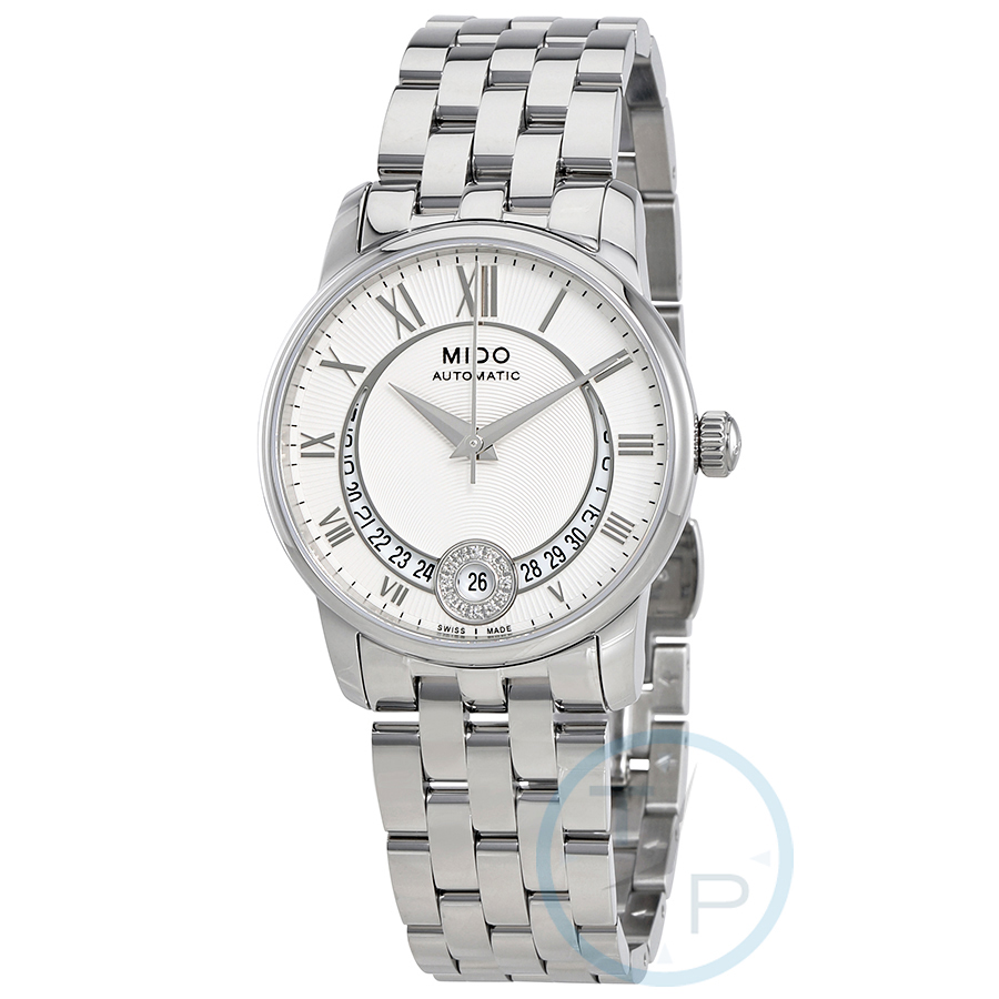 Silver-tone stainless steel case with a silver-tone stainless steel bracelet. Fixed silver-tone stainless steel bezel. Silver dial with silver-tone dauphine-style shape hands and Roman numeral hour markers. Minute markers around the outer rim. Dial Type: Analog. Date display at the 6 o'clock position. ETA Caliber C07.611 Automatic movement, containing 25 Jewels, bitting at 21600 vph, and has a power reserve of approximately 80 hours. Scratch resistant sapphire crystal. Screw down crown. Skeleton case back. Round case shape, case size: 33 mm, case thickness: 9.4 mm. Band width: 20 mm. Fold over clasp. Water resistant at 50 meters / 165 feet. Functions: date, hour, minute, second. Baroncelli II Series. Casual watch style. Watch label: Swiss Made. Mido Baroncelli II Automatic Ladies Watch M0072071103800.