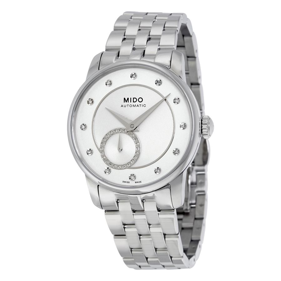 Stainless steel case with a stainless steel bracelet. Fixed stainless steel bezel. Silver dial with silver-tone dauphine-style hands and diamond hour markers. Dial Type: Analog. Small seconds sub-dial at the 7 o'clock position. ETA caliber 2825-2 automatic movement, based upon ETA 2824-2, containing 25 Jewels, bitting at 28800 vph, and has a power reserve of approximately 42 hours. Scratch resistant sapphire crystal. Pull / push crown. Transparent case back. Round case shape. Case size: 35 mm. Case thickness: 10.9 mm. Band width: 19 mm. Fold over clasp with a push button release. Water resistant at 50 meters / 165 feet. Functions: hour, minute, second. Baroncelli II Series. Dress watch style. Watch label: Swiss Made. Mido Baroncelli II Automatic Diamond Ladies Watch M007.228.11.036.00.