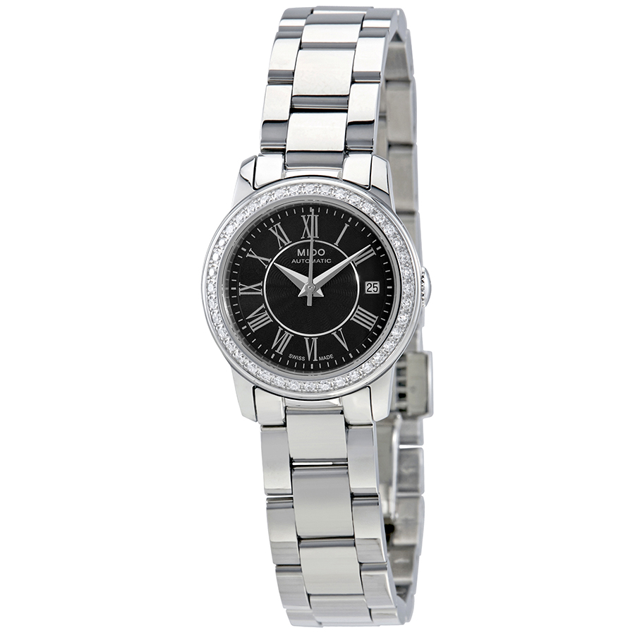 Stainless steel case with a stainless steel bracelet. Fixed stainless steel bezel set wih diamonds. Black dial with silver-tone dauphine-style hands and Roman numeral hour markers. Minute markers around the outer rim. Dial Type: Analog. Date display at the 6 o'clock position. Automatic movement. Scratch resistant mineral crystal. Pull / push crown. Transparent case back. Round case shape. Case size: 33 mm. Case thickness: 10 mm. Band width: 18 mm. Fold over clasp with a safety release. Water resistant at 50 meters / 165 feet. Functions: date, hour, minute, second. Baroncelli IIi Series. Casual watch style. Watch label: Swiss Made. Mido Baroncelli III Automatic Diamond Black Dial Ladies Watch M0100071105300.