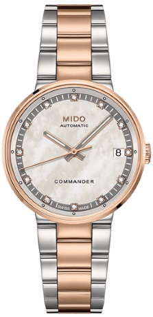 Stainless steel case with a two-tone (silver-tone and rose gold PVD) stainless steel bracelet. Fixed rose gold PVD bezel. White mother of pearl dial with luminous rose gold-tone hands and dimaond hour markers. Minute markers around the outer rim. Dial Type: Analog. Luminescent hands. Date display at the 3 o'clock position. Automatic movement. Scratch resistant sapphire crystal. Pull / push crown. Transparent case back. Round case shape. Case size: 33 mm. Case thickness: 10.53 mm. Fold over clasp. Water resistant at 50 meters / 165 feet. Functions: date, hour, minute, second. Commander II Series. Casual watch style. Watch label: Swiss Made. Mido Commander II Automatic White Mother of Pearl Dial Watch M014.207.22.116.80.