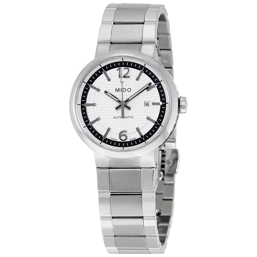 Stainless steel case with a stainless steel bracelet. Fixed stainless steel bezel. Silver dial with black hands and index hour markers. Arabic numerals mark the 6 and 12 o'clock positions. Minute markers around the outer rim. Dial Type: Analog. Luminescent hands and markers. Date display at the 3 o'clock position. ETA 2678 automatic movement with a 38-hour power reserve. Scratch resistant sapphire crystal. Pull / push crown. Transparent case back. Case size: 31 mm. Case thickness: 9.55 mm. Round case shape. Band width: 9 mm. Fold over clasp. Water resistant at 50 meters / 165 feet. Functions: date, hour, minute, second. Dress watch style. Watch label: Swiss Made. Mido Great Wall Automatic Ladies Watch M017.230.11.037.09.