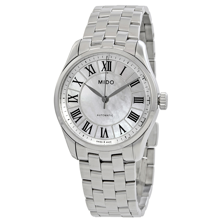 Silver-tone stainless steel case with a silver-tone stainless steel bracelet. Fixed silver-tone stainless steel bezel. Mother of pearl dial with black leaf-style shape hands and Roman numeral hour markers. Minute markers around the outer rim. Dial Type: Analog. ETA Caliber C07.611 Automatic movement, containing 25 Jewels, bitting at 21600 vph, and has a power reserve of approximately 80 hours. Scratch resistant sapphire crystal. Transparent case back. Round case shape, case size: 33 mm, case thickness: 9.95 mm. Band width: 18 mm. Deployment clasp. Water resistant at 50 meters / 165 feet. Functions: hour, minute, second. Belluna II Series. Dress watch style. Watch label: Swiss Made. Mido Belluna II Mother of Pearl Dial Ladies Watch M024.207.11.110.00.