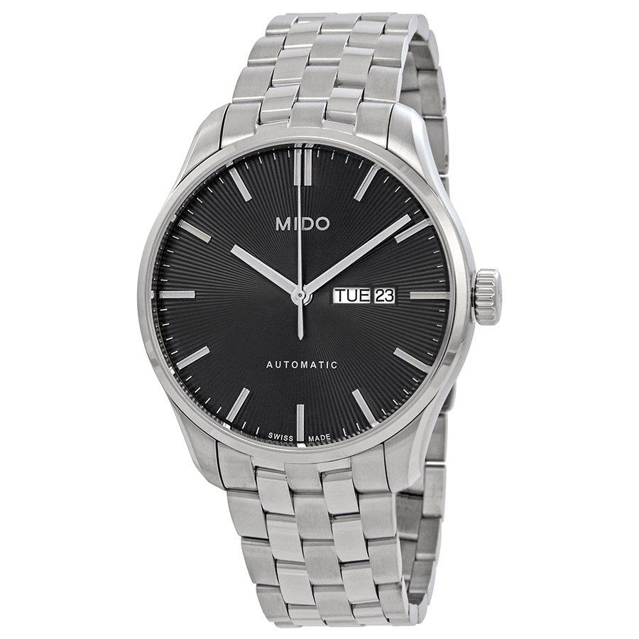 Stainless steel case with a stainless steel bracelet. Fixed stainless steel bezel. Anthracite dial with silver-tone hands and index hour markers. Minute markers around the outer rim. Dial Type: Analog. Day of the week and date display at the 3 o'clock position. Automatic movement. Scratch resistant sapphire crystal. Transparent case back. Round case shape, case size: 42.50 mm, case thickness: 10.82 mm. Band width: 21 mm. Deployment clasp. Water resistant at 50 meters / 165 feet. Functions: date, day, hour, minute, second. Dress watch style. Watch label: Swiss Made. Mido Belluna II Automatic Anthracite Dial Mens Watch M024.630.11.061.00.