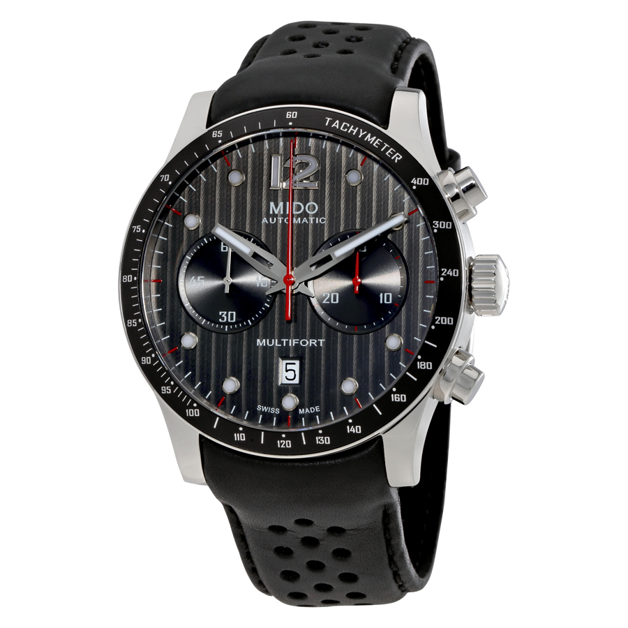 Stainless steel case with a black leather strap. Fixed stainless steel bezel with a black top ring showing tachymeter markings. Black dial with luminous grey hands and dot hour markers. An Arabic numeral appears at the 12 o'clock position. Minute markers around the outer rim. Dial Type: Analog. Luminescent hands and markers. Date display at the 6 o'clock position. Chronograph - two sub-dials displaying: 60 seconds and 30 minute. Mido calibre 60 automatic movement, based upon Valjoux 7753, containing 27 Jewels, bitting at 28800 vph, and has a power reserve of approximately 60 hours. Scratch resistant sapphire crystal. Transparent case back. Round case shape. Case size: 44 mm. Case thickness: 14.7 mm. Band width: 23 mm. Fold over clasp with a push button release. Water resistant at 100 meters / 330 feet. Functions: chronograph, date, hour, minute, second, tachymeter. Multifort Series. Dress watch style. Watch label: Swiss Made. Mido Multifort Chronograph Automatic Mens Watch M025.627.16.061.00.