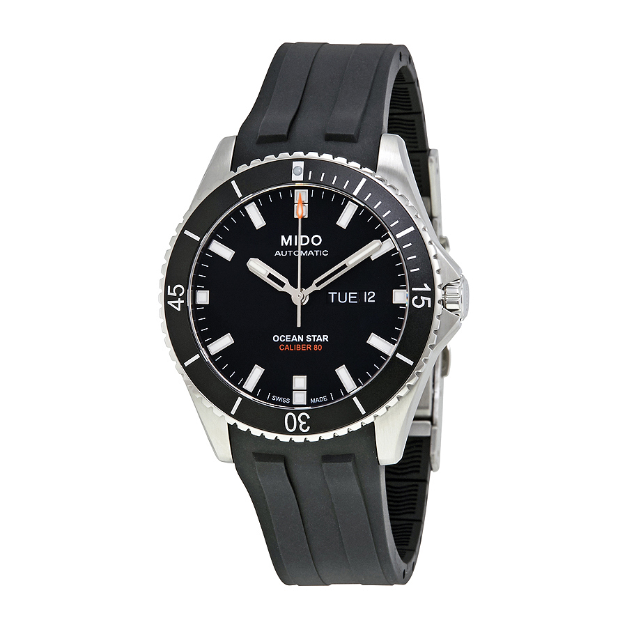 Stainless steel case with a black rubber strap. Uni-directional rotating stainless steel bezel with a black top ring. Black dial with luminous silver-tone hands and index hour markers. Minute markers around the outer rim. Dial Type: Analog. Luminescent hands and markers. Day of the week and date display at the 3 o'clock position. Mido calibre Powermatic 80 (ETA C07.621) automatic movement, based upon ETA 2824-2, containing 23 Jewels, bitting at 21600 vph, and has a power reserve of approximately 80 hours. Scratch resistant sapphire crystal. Screw down crown. Solid case back. Round case shape. Case size: 42.5 mm. Case thickness: 11.75 mm. Band width: 22 mm. Fold over clasp. Water resistant at 200 meters / 660 feet. Functions: date, day, hour, minute, second. Additional Info: suitable for professional marine activity serious surface water sports and skin diving. Ocean star captain series. Sport watch style. Watch label: Swiss Made. Mido Ocean Star Captain Automatic Mens Watch M026.430.17.051.00.