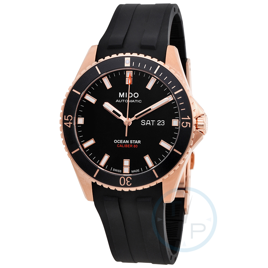 Rose gold-plated stainless steel case with a black rubber strap. Uni-directional rotating rose gold-plated bezel with a black top ring. Black dial with luminous rose gold-tone hands and index hour markers. Minute markers around the outer rim. Dial Type: Analog. Luminescent hands and markers. Day of the week and date display at the 3 o'clock position. Mido calibre Powermatic 80 (ETA C07.621) automatic movement, based upon ETA 2824-2, containing 23 Jewels, bitting at 21600 vph, and has a power reserve of approximately 80 hours. Scratch resistant sapphire crystal. Screw down crown. Solid case back. Round case shape. Case size: 42.5 mm. Case thickness: 11.75 mm. Band width: 20 mm. Deployment clasp with a push button release. Water resistant at 200 meters / 660 feet. Functions: date, day, hour, minute, second. Additional Info: suitable for professional marine activity serious surface water sports and skin diving. Ocean Star Captain Series. Casual watch style. Watch label: Swiss Made. Mido Ocean Star Captain Black Dial Mens Watch M026.430.37.051.00.