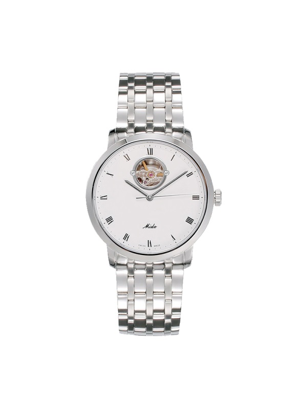 Stainless steel case and bracelet. Fixed stainless steel bezel. Silver (open heart) dial with silver-tone hands and Roman numeral hour markers. Minute markers around the outer rim. Dial Type: Analog. ETA Caliber 2824-2 Automatic movement, based upon ETA 2824, containing 25 Jewels, bitting at 28800 vph, and has a power reserve of approximately 38 hours. Scratch resistant sapphire crystal. Pull / push crown. Solid case back. Round case shape, case size: 38 mm, case thickness: 9 mm. Band width: 20 mm. Fold over clasp with a push button release. Water resistant at 30 meters / 100 feet. Casual watch style.