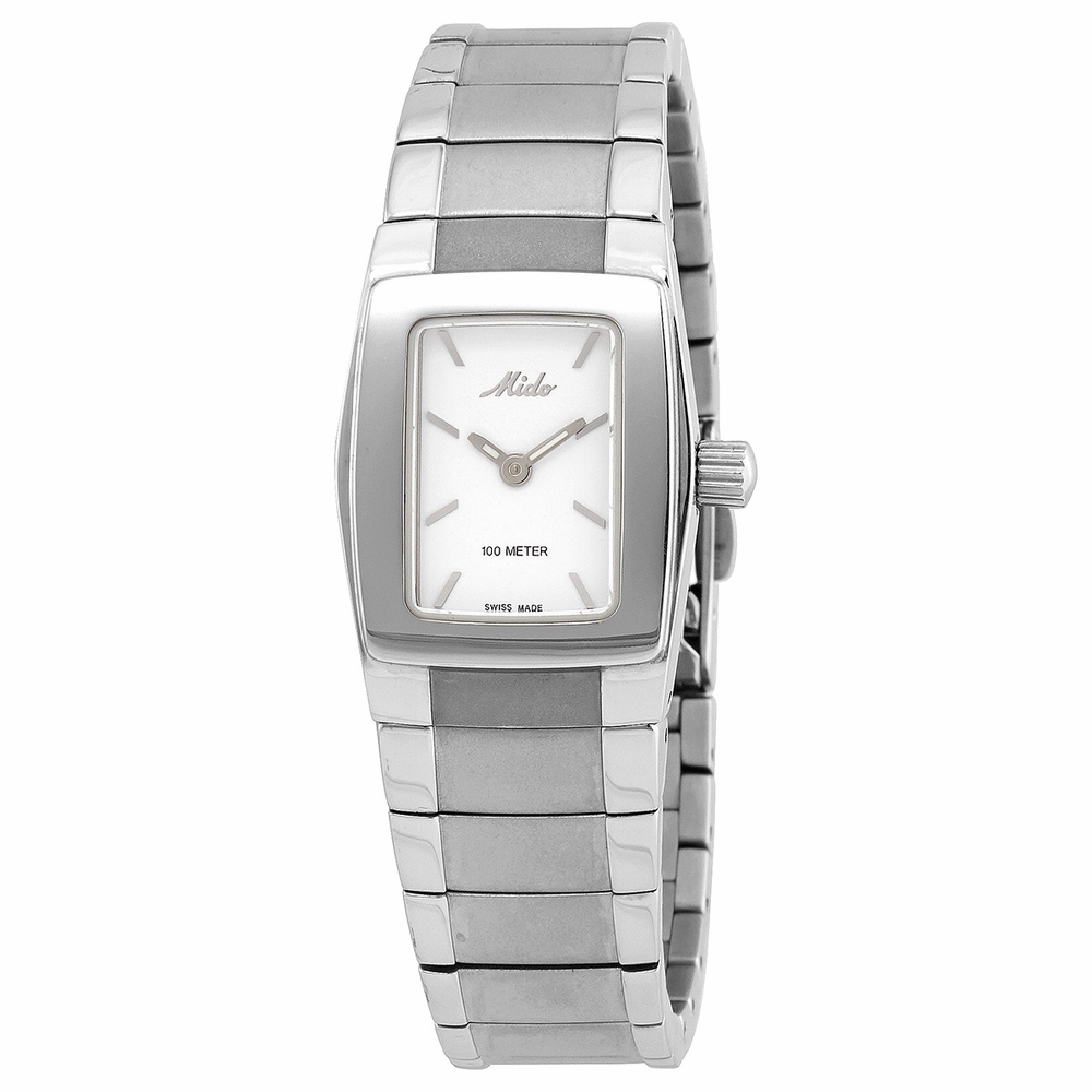 Stainless steel case with a stainless steel bracelet. Fixed stainless steel bezel. White dial with luminous silver-tone hands and index hour markers. Dial Type: Analog. Luminescent hands. Quartz movement. Scratch resistant sapphire crystal. Pull / push crown. Solid case back. Rectangle case shape. Fold over clasp with a safety release. Water resistant at 100 meters / 330 feet. Functions: hour, minute. Dress watch style. Watch label: Swiss Made. Mido White Dial Stainless Steel Ladies Watch M4040.4.16.1.