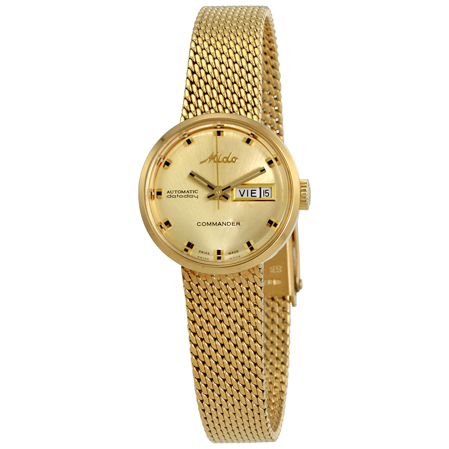Yellow gold PVD stainless steel case with a yellow gold PVD stainless steel mesh bracelet. Fixed yellow gold PVD bezel. Rose gold-tone dial with yellow gold-tone hands and index hour markers. Dial Type: Analog. Day of the week and date display at the 3 o'clock position. Mido calibre ETA 2678 automatic movement with a 40-hour power reserve. Scratch resistant Hesalit crystal. Solid case back. Round case shape. Case size: 24 mm. Case thickness: 10.50 mm. Box clasp. Water resistant at 50 meters / 165 feet. Functions: date, day, hour, minute, second. Additional Info: Day of the week is shown in spanish. Casual watch style. Watch label: Swiss Made. Mido Commander I Gold PVD Stainless Steel Automatic Ladies Watch M716937213.