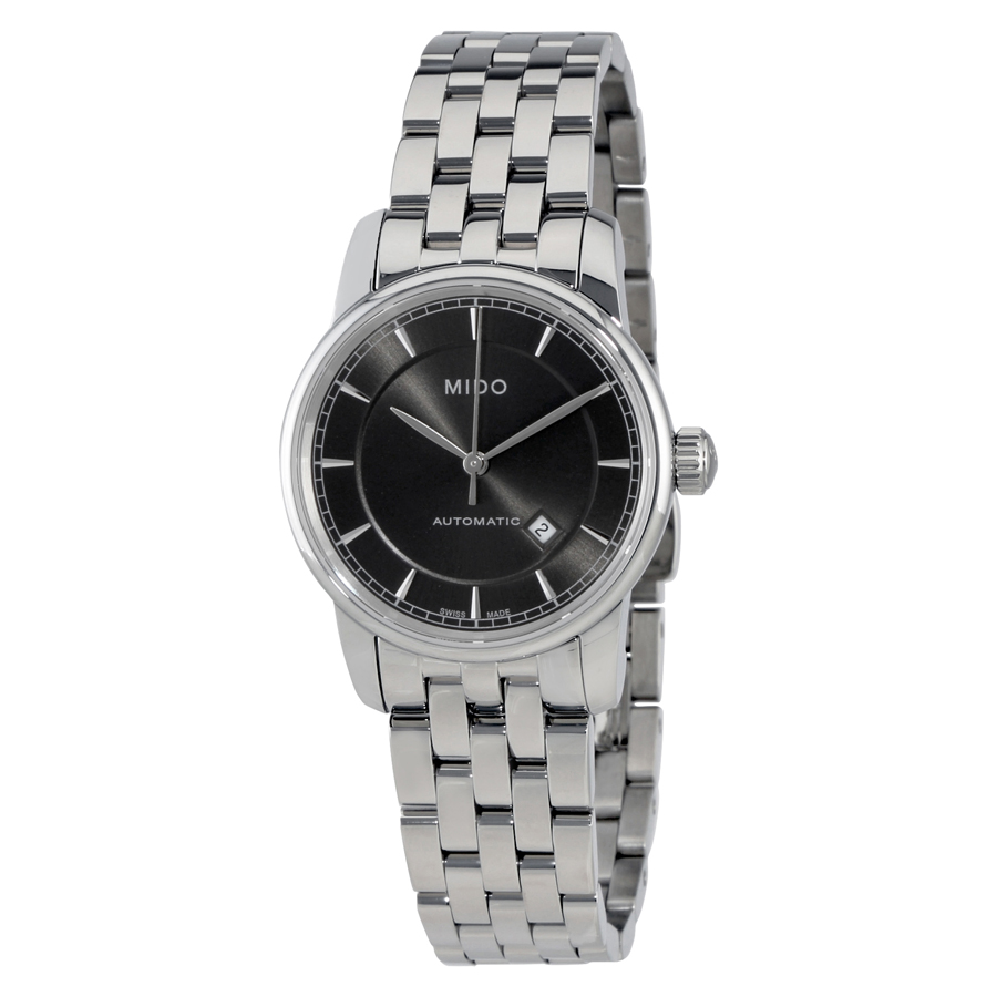 Stainless steel case with a stainless steel bracelet. Fixed stainless steel bezel. Grey dial with silver-tone hands and index hour markers. Minute markers around the outer rim. Dial Type: Analog. Date display between the 4 and 5 o'clock positions. ETA 2671 automatic movement. Scratch resistant sapphire crystal. Transparent case back. Case size: 29 mm. Case thickness: 9 mm. Round case shape. Band width: 15 mm. Deployment clasp. Water resistant at 50 meters / 165 feet. Functions: date, hour, minute, second. Dress watch style. Watch label: Swiss Made. Mido Baroncelli II Automatic Grey Dial Ladies Watch M76004131.