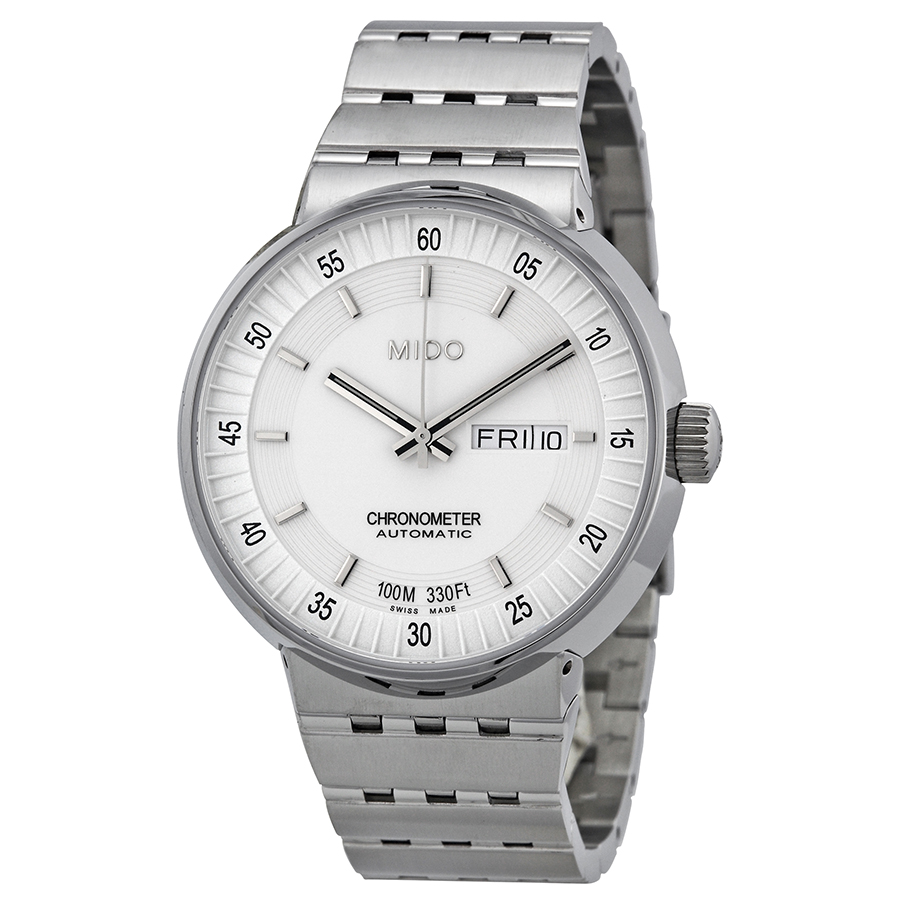 Stainless steel case with a stainless steel bracelet. Fixed stainless steel bezel. White cream dial with luminous silver-tone hands and index hour markers. Arabic numeral minute markers (at 5 minute intervals). Dial Type: Analog. Luminescent hands and markers. Day of the week and date display at the 3 o'clock position. ETA caliber 2836-2 (COSC) Aatomatic movement, based upon ETA 2824-2, containing 25 Jewels, bitting at 28800 vph, and has a power reserve of approximately 40 hours. Scratch resistant sapphire crystal. Screw down crown. Transparent case back. Round case shape. Case size: 40 mm. Case thickness: 10 mm. Band width: 20 mm. Band length: 8.5 inches. Fold over clasp with a safety release. Water resistant at 100 meters / 330 feet. Functions: date, day, hour, minute, second, chronometer. All Dial Series. Casual watch style. Watch label: Swiss Made. Item Variations: M83404B111. Mido All Dial Chronometer Automatic White Dial Stainless Steel Mens Watch M83404B111.