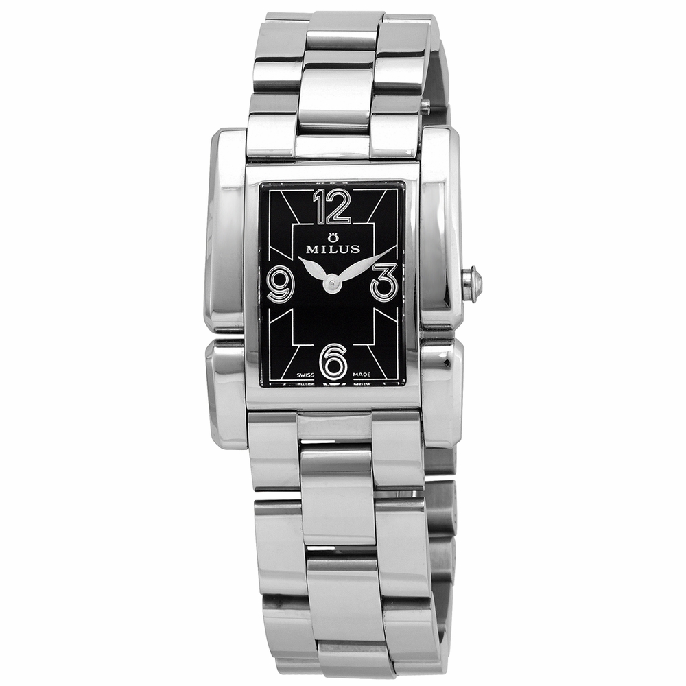 Stainless steel case with a stainless steel bracelet. Fixed stainless steel bezel. Black dial with silver-tone hands and index hour markers. Arabic numerals mark the 3, 6, 9 and 12 o'clock positions. Dial Type: Analog. Quartz movement. Scratch resistant mineral crystal. Pull / push crown. Solid case back. Rectangle case shape. Hidden fold over clasp. Water resistant at 30 meters / 100 feet. Functions: hour, minute. Apiana Series. Dress watch style. Watch label: Swiss Made. MILUS Apiana Quartz Black Dial Stainless Steel Ladies Watch API031.
