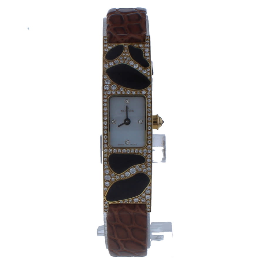 Yellow gold-tone 18kt yellow gold case with a brown alligator band. Fixed yellow gold-tone bezel with diamond set 18kt yellow gold. Mother of pearl dial with yellow gold-tone hands and diamond hour markers. Dial Type: Analog. Quartz movement. Solid case back. Rectangle case shape, case size: 12 mm. Buckle clasp. Functions: hour, minute. Eridana Series. Dress watch style. Watch label: Swiss Made. Milus Eridana Quartz Diamond Ladies Watch ERI111.