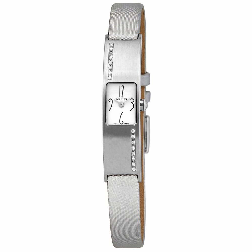 Silver-tone stainless steel case with a grey satin strap. Fixed bezel. White dial with silver-tone hands and Arabic numeral hour markers. Dial Type: Analog. Quartz movement. Scratch resistant sapphire crystal. Pull / push crown. Solid case back. Rectangle case shape. Buckle clasp. Water resistant at 30 meters / 100 feet. Functions: hour, minute. Eridana Series. Dress watch style. Watch label: Swiss Made. MILUS Eridana Quartz White Dial Ladies Watch ERI020.