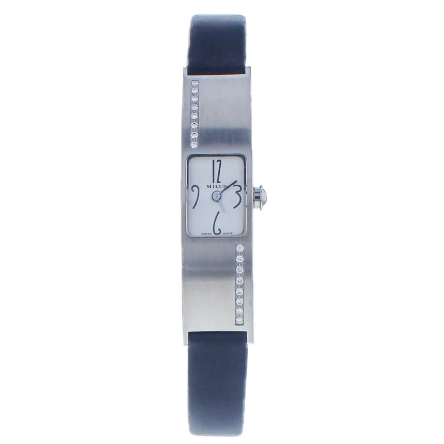 Silver-tone stainless steel case with a black satin strap. Fixed silver-tone bezel with diamond set stainless steel. Silver-tone dial with silver-tone hands and Arabic numeral hour markers. Dial Type: Analog. Quartz movement. Solid case back. Rectangle case shape, case size: 11 mm. Buckle clasp. Functions: hour, minute. Eridana Series. Dress watch style. Watch label: Swiss Made. Milus Eridana Quartz Diamond Silver Dial Ladies Watch ERI015.