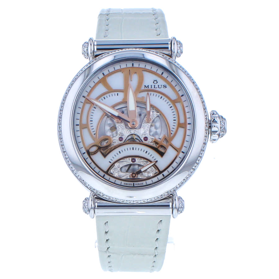 18kt white gold case with a crocodile leather strap. Fixed 18kt white gold bezel. Mother of pearl dial with rose gold-tone hands and Arabic & index hour markers. Minute markers around the outer rim. Dial Type: Analog. Luminescent hands and markers. Automatic movement. Scratch resistant sapphire crystal. Round case shape, case size: 35 mm. Buckle clasp. Functions: hour, minute, second. Merea Series. Dress watch style. Watch label: Swiss Made. Milus Merea Automatic Ladies Watch MER302.