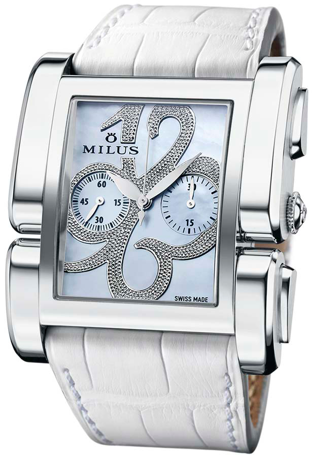 Silver-tone stainless steel case with a white leather strap. Fixed silver-tone stainless steel bezel. Grey mother of pearl dial with silver-tone leaf-style shape hands and Arabic numeral hour markers. Dial Type: Analog. Chronograph - two sub-dials displaying: 60 second and 30 minute. ETA Caliber 2094 Automatic movement, containing 33 Jewels, bitting at 28800 vph, and has a power reserve of approximately 42 hours. Scratch resistant sapphire crystal. Transparent case back. Square case shape, case size: 39 mm x 45 mm. Band width: 30 mm, band length: 7 inches. Buckle clasp. Water resistant at 30 meters / 100 feet. Functions: chronograph, hour, minute, second. Apiana Series. Dress watch style. Watch label: Swiss Made. Milus Apiana Chronograph Automatic Ladies Watch APIC003F.