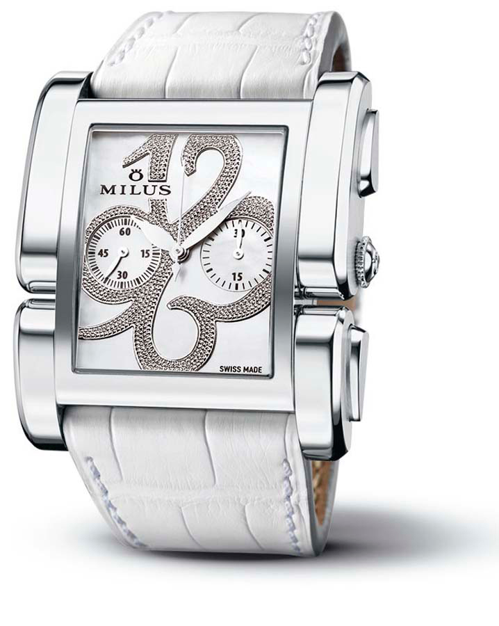 Silver-tone stainless steel case with a white leather strap. Fixed silver-tone stainless steel bezel. Mother of pearl dial with silver-tone leaf-style shape hands and Arabic numeral hour markers. Dial Type: Analog. Chronograph - two sub-dials displaying: 60 second and 30 minute. ETA Caliber 2094 Automatic movement, containing 33 Jewels, bitting at 28800 vph, and has a power reserve of approximately 42 hours. Scratch resistant sapphire crystal. Pull / push crown. Transparent case back. Square case shape, case size: 39 mm x 45 mm. Band width: 30 mm, band length: 7 inches. Buckle clasp. Water resistant at 30 meters / 100 feet. Functions: chronograph, hour, minute, second. Apiana Series. Luxury watch style. Watch label: Swiss Made. Milus Apiana Chronograph Automatic Mens Watch APIC015.