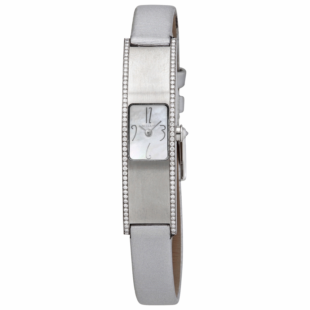 Silver-tone stainless steel case with a grey satin strap. Fixed bezel with diamond set. Mother of pearl dial with silver-tone hands and Arabic numeral hour markers. Dial Type: Analog. Quartz movement. Scratch resistant sapphire crystal. Pull / push crown. Solid case back. Rectangle case shape. Water resistant at 30 meters / 100 feet. Functions: hour, minute. Eridana Series. Dress watch style. Watch label: Swiss Made. Milus Womens ERI013 Eridana Grey Strap Mother-of-PearLadies Watch ERI013.