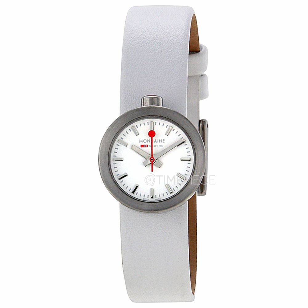 Stainless steel case with a white leather strap. Fixed stainless steel bezel. White dial with silver-tone hands and index hour markers. Minute markers around the outer rim. Dial Type: Analog. Quartz movement. Scratch resistant mineral crystal. Pull / push crown. Solid case back. Round case shape. Case size: 22 mm. Case thickness: 10 mm. Band width: 18 mm. Tang clasp. Water resistant at 30 meters / 100 feet. Functions: hour, minute, second. Aura Series. Casual watch style. Watch label: Swiss Made. Mondaine Aura White Dial White Leather Strap Ladies Watch A6663032416SBA.