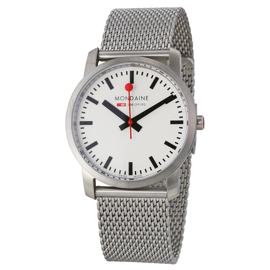 Stainless steel case with a stainless steel mesh bracelet. Fixed stainless steel bezel. White dial with black hands and index hour markers. Minute markers around the outer rim. Dial Type: Analog. Quartz movement. Scratch resistant sapphire crystal. Pull / push crown. Solid case back. Round case shape. Case size: 36 mm. Case thickness: 6.2 mm. Band width: 20 mm. Fold over slip through clasp. Water resistant at 30 meters / 100 feet. Functions: hour, minute, second. Simply Elegant Series. Casual watch style. Watch label: Swiss Made. Item Variations: A400 30351 16SBM, A400-30351-16SBM, A400/30351/16SBM, A4003035116SBM. Mondaine Simply Elegant White Dial Stainless Steel Mesh Ladies Watch A4003035116SBM.