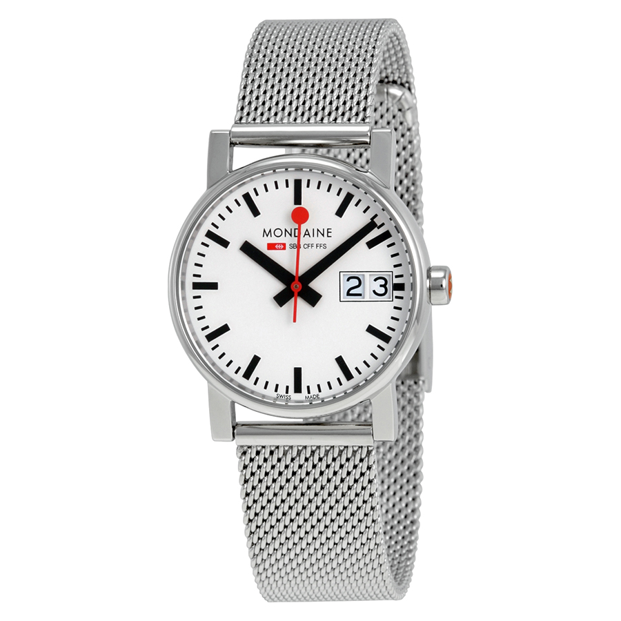 Stainless steel case with a stainless steel mesh bracelet. Fixed stainless steel bezel. White dial with black hands and index hour markers. Minute markers around the outer rim. Dial Type: Analog. Date display at the 3 o'clock position. Quartz movement. Ronda 509 engine. Scratch resistant mineral crystal. Pull / push crown. Solid case back. Case diameter: 30 mm. Case thickness: 9 mm. Round case shape. Band width: 16 mm. Fold over slip through clasp. Water resistant at 30 meters / 100 feet. Functions: date, hour, minute, second. Casual watch style. Watch label: Swiss Made. Mondaine Evo Big Date White Dial Stainless Steel Mesh Ladies Watch A669.30305.11SBM.