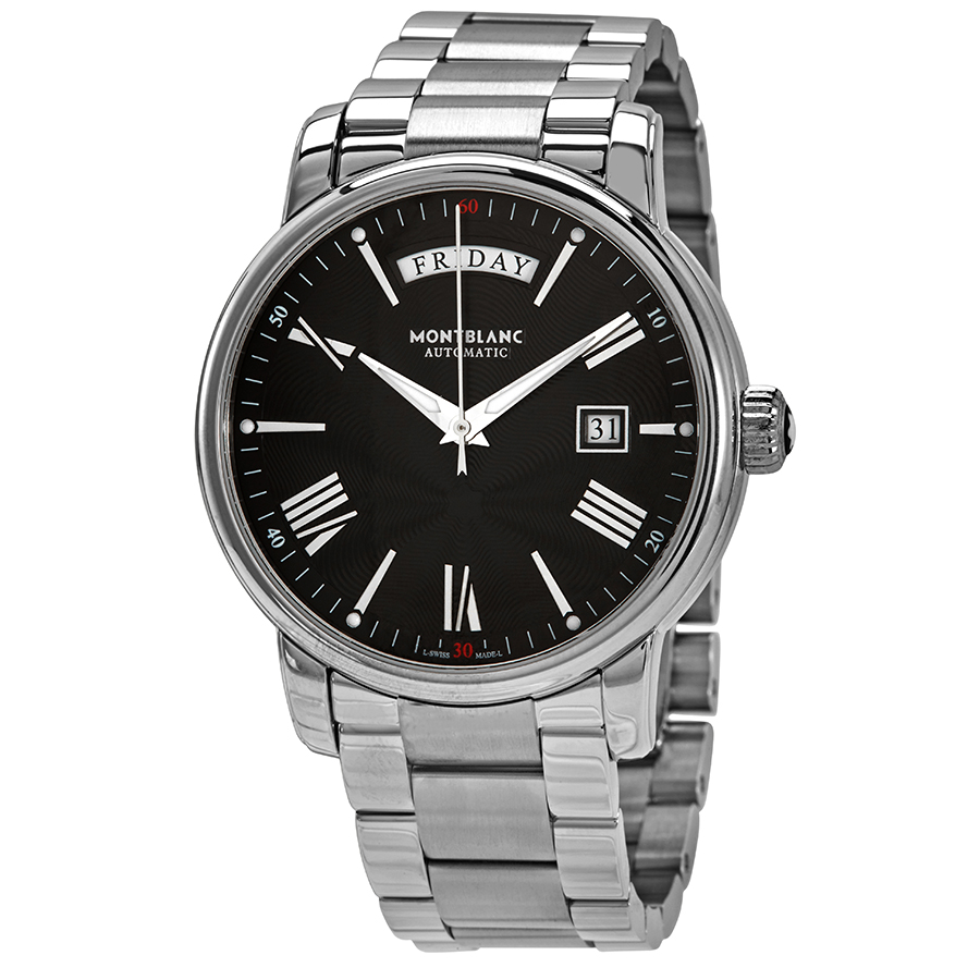 Stainless steel case with a stainless steel bracelet. Fixed stainless steel bezel. Black dial with luminous silver-tone hands and alternating Roman numeral and index hour markers. Minute markers around the outer rim. Dial Type: Analog. Luminescent hands and markers. Date display at the 3 o'clock position, Day of the week display centered on the 12 o'clock position. Montblanc calibre MB 24.18 automatic movement with a 38-hour power reserve. Scratch resistant sapphire crystal. Transparent case back. Round case shape. Case size: 40.5 mm. Case thickness: 10.14 mm. Band width: 20 mm. Fold over clasp with a push button release. Water resistant at 50 meters / 165 feet. Functions: date, day, hour, minute, second. Dress watch style. Watch label: Swiss Made. Montblanc 4810 Day-Date Automatic Black Dial Mens Watch 115937.