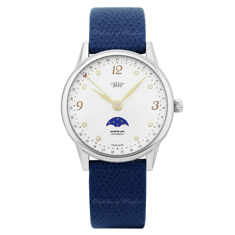 Stainless steel case with a blue (calfskin) leather strap. Fixed stainless steel bezel. White dial with gold-tone hands and diamond hour markers. Arabic numerals appear at thje 3, 9 and 12 o'clock positions. Minute markers. Date scale around the outer rim. Dial Type: Analog. Month display below the 12 o'clock position. Moonphase display. Caliber MB 29.17 automatic movement with a 42-hour power reserve. Scratch resistant sapphire crystal. Pull / push crown. Solid case back. Round case shape. Case size: 36 mm. Band width: 18 mm. Tang clasp. Water resistant at 30 meters / 100 feet. Functions: date, hour, minute, second, moon phase display. Boheme Series. Dress watch style. Watch label: Swiss Made. Montblanc Boheme Automatic Diamond White Dial Ladies Watch 119938.