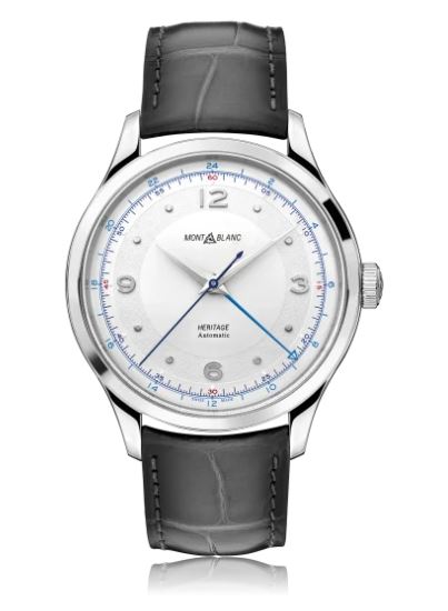 Stainless steel case with a grey (alligator) leather strap. Fixed stainless steel bezel. Silvery white dial with silver-tone hands and dot hour markers. Arabic numerals appear at the 3, 6, 9 and 12 o'clock positions. Minute markers. Arabic numeral minute markers (at 5 minute intervals). 24 hour markers around the outer rim. Dial Type: Analog. Caliber MB 24.05 automatic movement with a 42-hour power reserve. Scratch resistant sapphire crystal. Pull / push crown. Solid case back. Round case shape. Case size: 40 mm. Case thickness: 11.8 mm. Band width: 20 mm. Tang clasp. Water resistant at 50 meters / 165 feet. Functions: hour, minute, second, 24 hour. Heritage Gmt Series. Luxury watch style. Watch label: Swiss Made. Montblanc Heritage GMT Automatic Silvery White Dial Watch 119948.