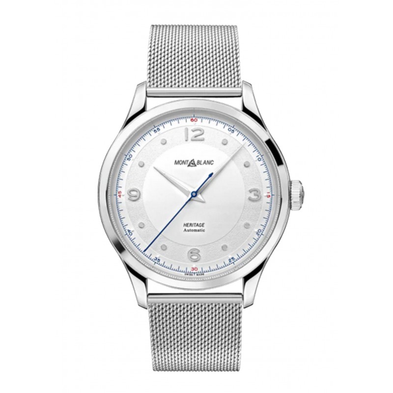 Stainless steel case with a stainless steel mesh bracelet. Fixed stainless steel bezel. Silvery white dial with silver-tone hands and dot hour markers. Arabic numerals appear at the 3, 6, 9 and 12 o'clock positions. Arabic numeral minute markers (at 5 minute intervals). Minute markers around the outer rim. Caliber MB 24.26 automatic movement with a 36-hour power reserve. Scratch resistant sapphire crystal. Pull / push crown. Transparent case back. Round case shape. Case size: 40 mm. Fold over slip through clasp. Water resistant at 50 meters / 165 feet. Functions: hour, minute, second. Heritage Series. Luxury watch style. Watch label: Swiss Made. Montblanc Heritage Automatic Silvery White Dial Unisex Watch 119945.