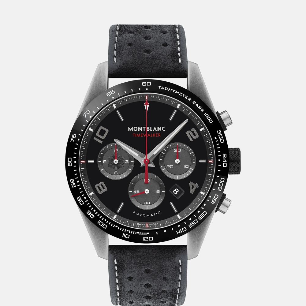 Stainless steel case with a black leather strap. Fixed black ceramic bezel showing tachymeter markers. Black dial with luminous silver-tone hands and Arabic numeral and index hour markers. Minute markers around the outer rim. Dial Type: Analog. Luminescent hands and markers. Date display between the 4 and 5 o'clock positions. Chronograph - three sub-dials displaying: 60 second, 30 minute and 12 hour. Calibre MB 25.10 automatic movement with a 46 mm power reserve. Scratch resistant sapphire crystal. Pull / push crown. Solid case back. Round case shape. Case size: 43 mm. Case thickness: 14.5 mm. Band width: 22 mm. Fold over clasp. Water resistant at 100 meters / 330 feet. Functions: chronograph, tachymeter, date, hour, minute, second. Timewalker Series. Luxury watch style. Watch label: Swiss Made. Montblanc TimeWalker Chronograph Automatic Black Dial Mens Watch 124073.