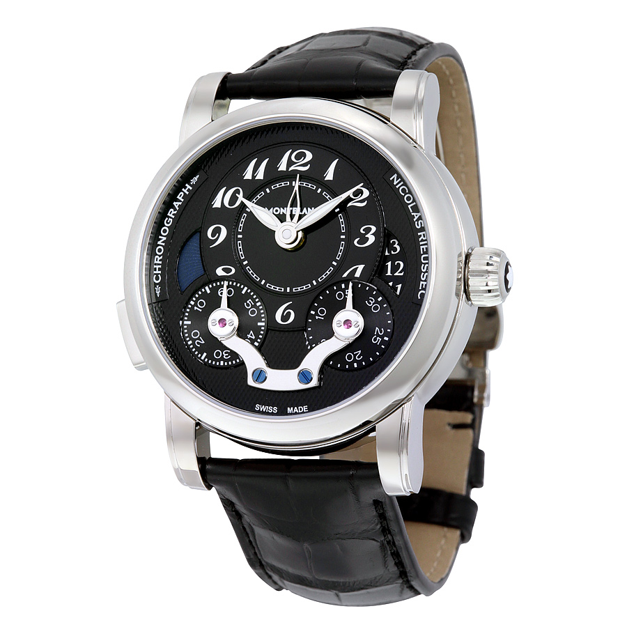 Stainless steel case with a black leather strap. Fixed stainless steel bezel. Black dial with luminous silver-tone hands and Arabic numeral hour markers. Minute markers around an inner circle. Dial Type: Analog. Luminescent hands and markers. Date display at the 3 o'clock position. Chronograph - two sub-dials displaying: 60 second and 30 minute. MontBlanc calibre MB R200 automatic movement with about 72 hours of power reserve. Scratch resistant sapphire crystal. Pull / push crown. Skeleton case back. Case size: 43 mm. Case thickness: 14.8 mm. Round case shape. Band width: 22 mm. Band length: 7.75 inches. Deployment with push button release clasp. Water resistant at 30 meters / 100 feet. Functions: chronograph, column wheel, monopoussoir, second time zone, date, hour, minute, second, day/night indicator. Luxury watch style. Watch label: Swiss Made. Montblanc Nicolas Rieussec Monopoussoir Chronograph Automatic Black Dial Mens Watch 106488.
