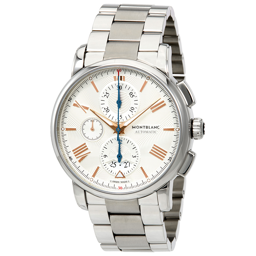 Silver-tone stainless steel case with a silver-tone stainless steel bracelet. Fixed silver-tone stainless steel bezel. Silvery white guilloche dial with rose gold-tone hands and index and Roman numeral hour markers. Minute markers around the outer rim. Dial Type: Analog. Luminescent hands and markers. Date display at the 6 o'clock position. Chronograph - three sub-dials displaying: 60 second, 30 minute and 12 hour. MontBlanc Calibre MB 25.01 Automatic movement, based upon ETA 7750, containing 25 Jewels, bitting at 28800 vph, and has a power reserve of approximately 46 hours. Scratch resistant sapphire crystal. Pull / push crown. Transparent case back. Round case shape, case size: 43 mm, case thickness: 13.68 mm. Band width: 20 mm / 22 mm. Fold over with safety release clasp. Water resistant at 50 meters / 165 feet. Functions: chronograph, date, hour, minute, second. 4810 Series. Luxury watch style. Watch label: Swiss Made. MontBlanc 4810 Chronograph Automatic Mens Watch 114856.