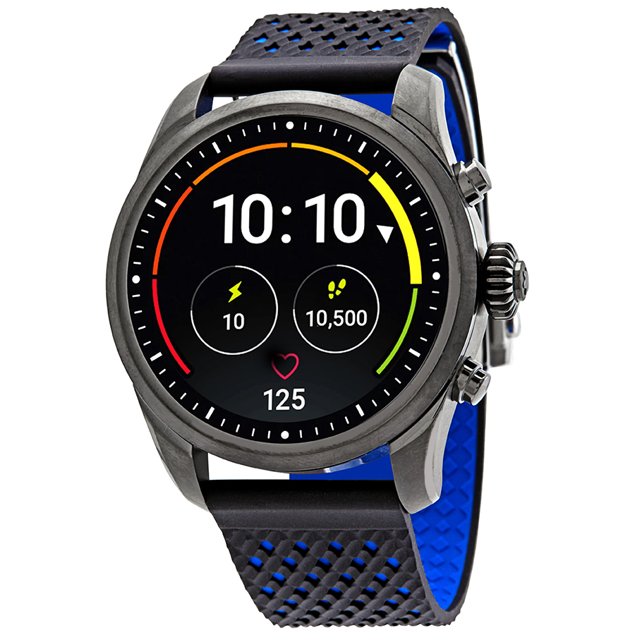 Titanium case with a blue rubber strap. Fixed bezel. Digital dial. Dial Type: digital. Quartz movement. Solid case back. Round case shape, case size: 42 mm, case thickness: 14.3 mm. Band width: 22 mm, band length: 120 / 80 mm. Folding clasp. Water resistant at 50 meters / 165 feet. Functions: hour, minute, second, heart rate, microphone, altimeter, accelerometer, gyroscope, ambient light, display: 1.2" full circle amoled, 390 x 390 (327 ppi). Additional Info: compatible with ios 9.3+ and android 4.4+ (excluding go edition), memory: 1 gb, storage: 8 gb, connectivity: bluetooth 4.2, wi-fi (802.11b/g/n 2.4ghz). Montblanc Summit 2 Sport Edition Quartz Unisex Smart Watch 119563.