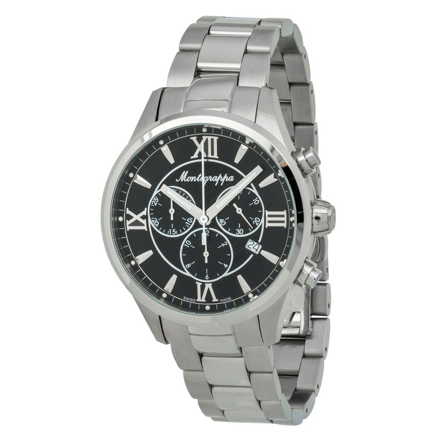 Silver-tone stainless steel case and bracelet. Fixed silver-tone stainless steel bezel. Black dial with silver-tone hands and Roman numeral & index hour markers. Minute markers around the outer rim. Dial Type: Analog. Luminescent hands. Date display at the 4 o'clock position. Chronograph - three sub-dials displaying: 60 second, 30 minute and 12 hour. Ronda 5030 D quartz movement. Scratch resistant sapphire crystal. Screw down crown. Solid case back. Round case shape, case size: 42 mm, case thickness: 12.5 mm. Band width: 20 mm, band length: 8.5 inches. Deployment with push button release clasp. Water resistant at 50 meters / 165 feet. Functions: chronograph, date, hour, minute, second. Fortuna Series. Casual watch style. Watch label: Swiss Made. Montegrappa Fortuna Chronograph Quartz Black Dial Mens Watch IDFOWCIC.